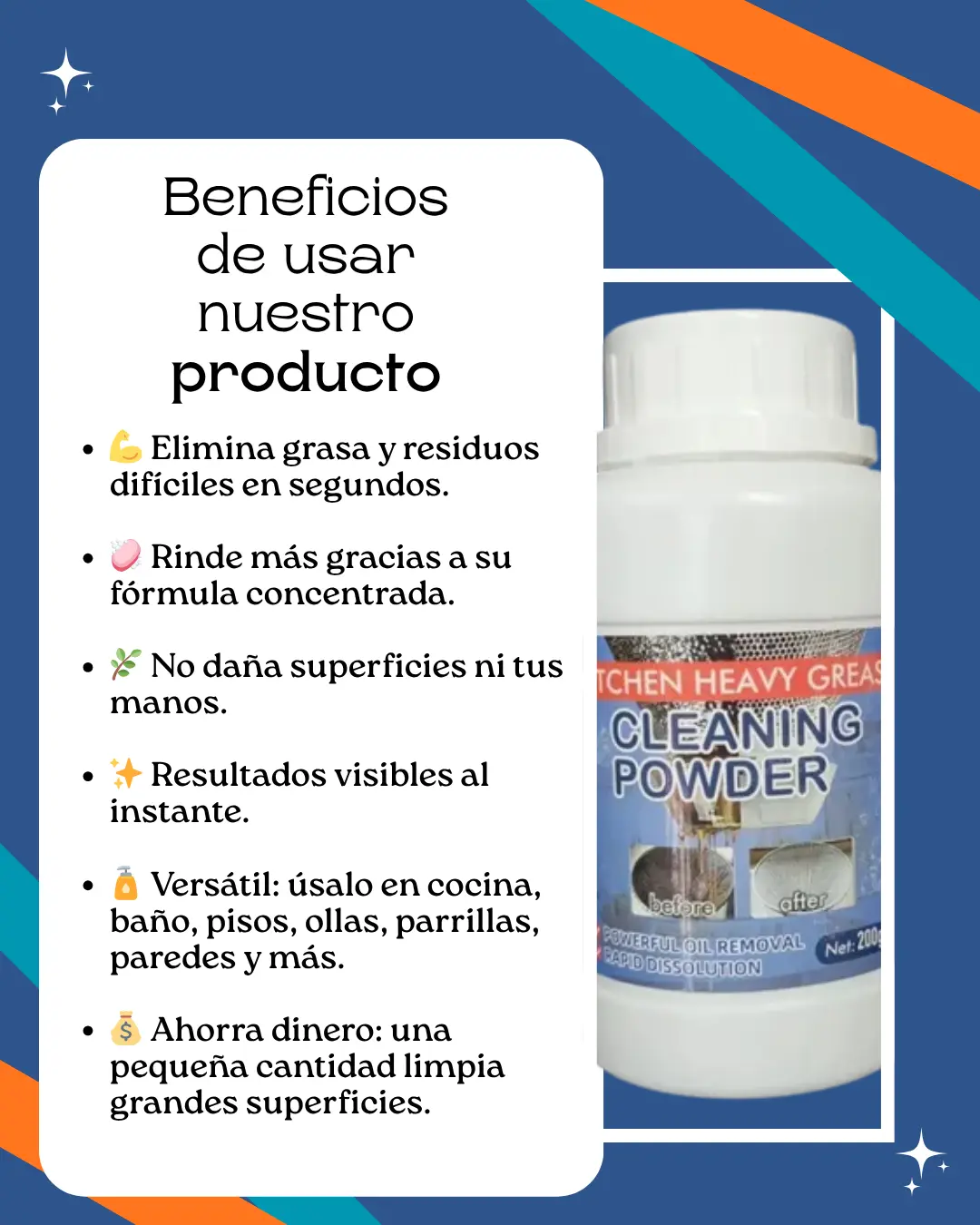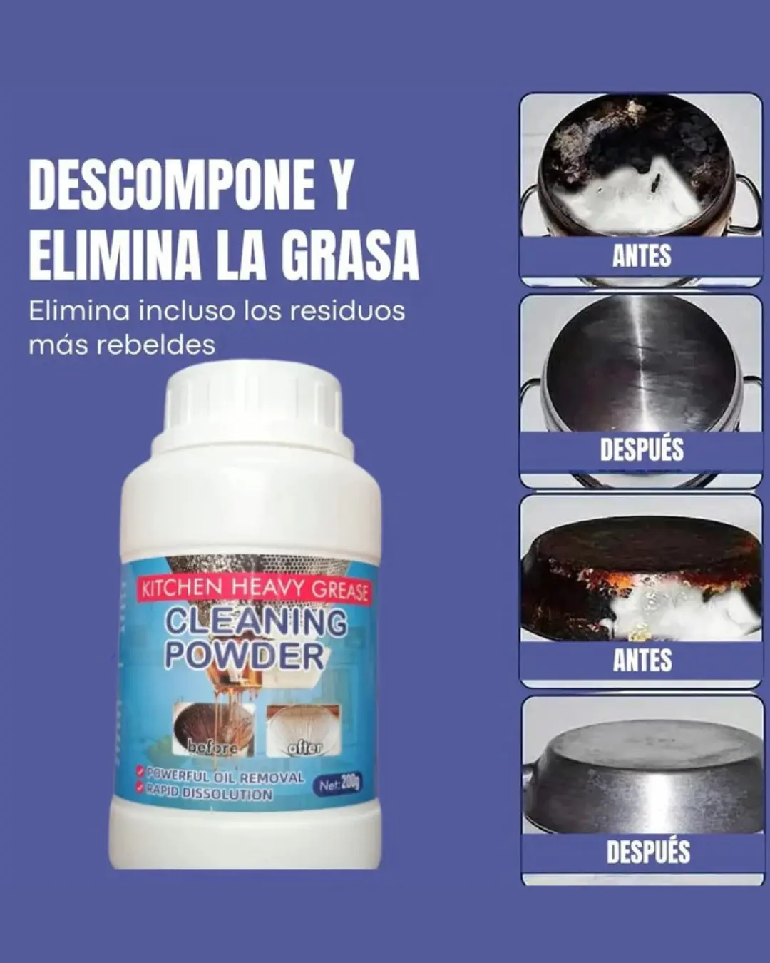 Este Polvo quita Grasa se convierte en una herramienta esencial en cualquier hogar o negocio. Limpia más, gasta menos y disfruta de un entorno verdaderamente limpio sin esfuerzo.